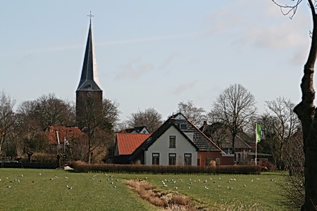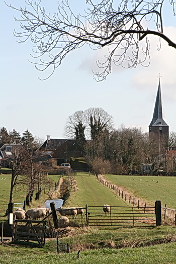 Dit vind ik ook een aangename voorjaarsplaat. De schapen op de voorgrond, de oude weg richting De Gouden Leeuw, de twee boomkronen bij de oude herberg, rechts de steile kerktoren.