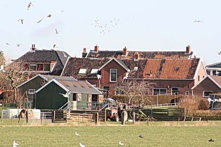 De blik noordwestwaarts gericht, vanaf onze standplaats langs de N355. De paardenschuur van Jan Tempel (Kzn) dichterbij ‘getrokken’. En dan valt je ineens op dat de opstallen van agrariër Smid (boerderij Norrits) nabij lijken. Vertekening…