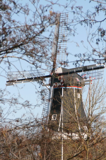 De koren- en pelmolen “Fortuna” (voorheen “De Fortuin”), achter de elzenstruiken, nou ja, bomen dan, langs de Mokkenburgweg. De elzenkatjes ‘vieren’ de lentekomst en maken zich zo te zien geen zorgen over hun bijdrage aan hooikoortsaanvallen….