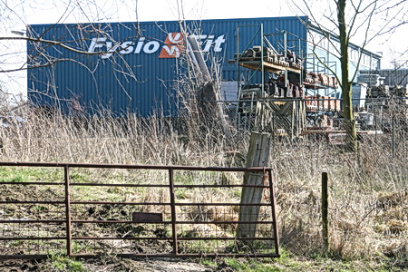 Op de achtergrond het voormalige garagepand waarin fitnesscentrum “Fysio Fit” een gemoderniseerd onderkomen heeft gerealiseerd. Zelfs op zondag dendert de spierversterkende dreunmuziek door de directe omgeving. Voor déze kant is het zo te zien niet bijster opwekkend….