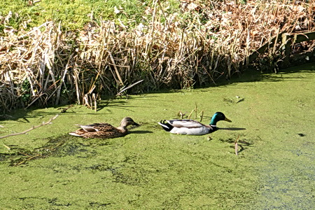 Het echtpaar Eend ten afscheid, in een van de kroossloten langs de Langestraat (Zuid). De woerd met glimmend groene kop vooraan, vrouwlief minder opvallend in zijn slipstream. Zijn ze mogelijke broedplaatsen aan het inspecteren? Het wordt LENTE!