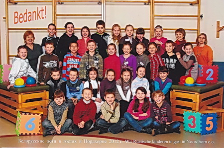 Met bovenstaande bedankkaart heeft de Stichting Tsjernobyl Kinderen Noordhorn haar sponsors bedankt voor de financiële ondersteuning. De 2012-groep van zo’n 30 kinderen, 2 leerkrachten en 1 sponsor is op 27 februari jongstleden weer vertrokken na een gastvrij verblijf in Noord- en Zuidhorn. De Wit-Russische groep uit Rechytsa (in het uiterste zuiden, de streek die te maken kreeg met de negatieve gevolgen van de kerncentraleramp bij het Oekraïense Tsjernobyl) is ‘gesterkt’ teruggekeerd in hun moederland en hoopt nog jarenlang profijt te hebben van de gezondheidsimpuls, hier opgedaan. Een geslaagd project, aldus de Stichting, voor de zesde keer. “Hartelijk dank!”