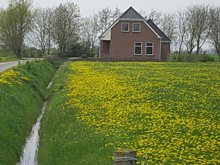 Paardenbloemenparadijs aan de Noordhornerweg richting Oldehove. Op de achtergrond de nieuwe woning op de plek waar eerder een arbeidershuisje stond…