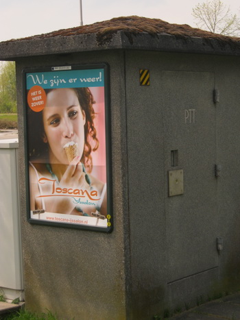 Soms valt je oog zo maar op iets, waaraan je waarschijnlijk al duizenden keren bent voorbijgegaan zonder dat ie opviel: de PTT-kast bij de eerste afslag van de N355 richting Noordhorn. Nee, niet die smullende dame op de reclameposter, meer het dak en de bekleding daarvan…. Deed me ineens denken aan organische architectuur, bedoeld om te groeien in de directe omgeving. Iets minimaals, verwant aan de “Apenrots” van de Gasunie en de met gras beklede bijgebouwen…