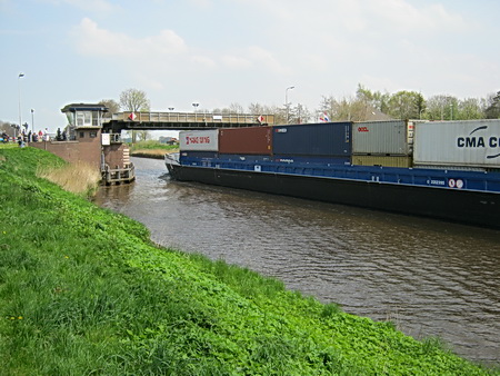 Weer zo’n joekel van een boot onder de hefbrug door, het lukt nog steeds….. Een schip vol containers, geen uitzondering meer. Goed dat de waterstand niet al te hoog is…
