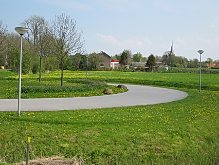 Groen met gele stippen vanaf de keerlus richting het dorp, met de nieuwe uitbouw van Villa Vrij als opvallend element!