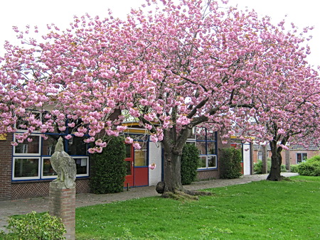 Een dag later, op 1 mei…. De prunusweelde nabij de OBS De Molshoop aan de Oosterweg. De twee oude bomen (in 1956 geplant?) doen het nog steeds overdadig goed.