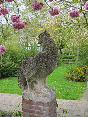 De bejaarde haan bij de entree van de OBS, happend naar prunusbloesem….