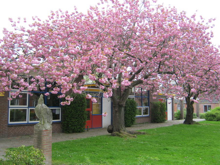 Het hart klopt me nog achter in de keel, de confrontatie met de tieners die zich bij de OBS De Molshoop uitleefden in anti-prunusgedrag doet me meer dan goed voor me is, blijkbaar…. Dilemma: Je komt langs je oude school waar je meer dan dertig jaar de plussen hebt bevorderd en de minnen hebt bestreden. Je ziet een groep jongeren de beide eerbiedwaardige Japanse kersen onheus bejegenen (= rukken aan takken, in de boom klimmen en de resterende bloesem met geweld verwijderen, bloesem met armenvol naar ‘elders’ brengen (achter de school) etc. Geen criminele daden, maar nou ook niet bepaald gedrag waarvan je zegt: “Goh, zijn die even goed bezig….!” En dan?