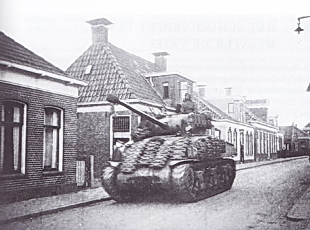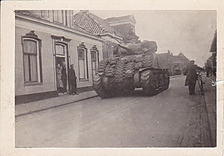 Ik herinner me nog dat een van wielen waarom zo’n rupsketting zat, kapot ging. Dat was bij Nanninga (grafstenen) voor de deur, bijna naast het kantongerecht. Met vereende krachten werd dat wiel vervangen en in de sloot gerold, Toen de tank weer was weggetuft, ging Nanninga met nog wat mannen het kapotte wiel uit de sloot trekken. Dat kostte heel wat zweetdruppels. De tanks op de foto’s zijn van het type Sherman, denk ik.