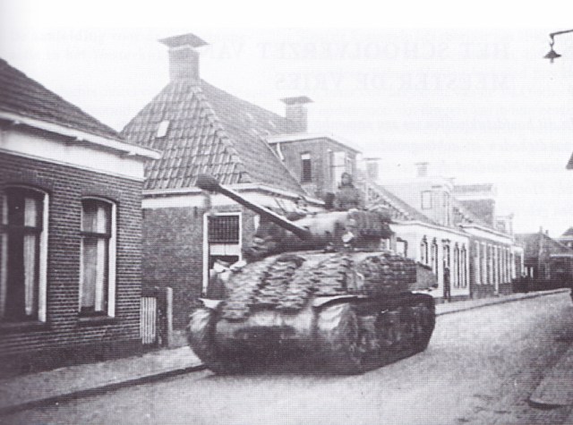 “Het zijn twee verschillende tanks, wel van hetzelfde type. Je kunt zien dat de reserve rupsbanden of -kettingen voorop de tank verschillend zijn. Ik herinner me nog dat een van de wielen waarom zo’n rupsketting zat, kapot ging. Dat was bij Nanninga (grafstenen) voor de deur, bijna naast het kantongerecht. Met vereende krachten werd dat wiel vervangen en in de sloot gerold, Toen de tank weer was weggetuft, ging Nanninga met nog wat mannen het kapotte wiel uit de sloot trekken. Dat kostte heel wat zweetdruppels. De tanks op de foto’s zijn van het type Sherman, denk ik.”