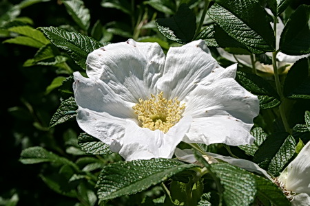 Bij het dorpshuis aan de Noorderweg bloeien de wilde (botanische) rozen en dat is een foto waard. Wit wil nog wel eens tegenvallen, deze is mooi om naar te kijken.