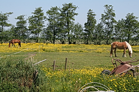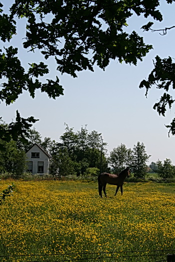 Een prachtig gestroomlijnd paard te midden van duizenden bloeiende boterbloemen. En het romantische witte huisje op de achtergrond (vroegere woning van de eerste arbeider….)