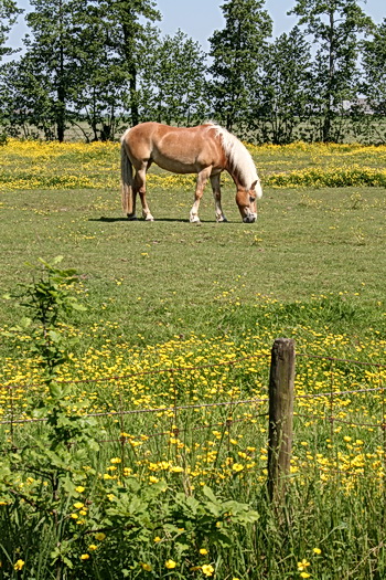 Nou, vooruit, eerbetoon aan het tweede in beeld verschijnende paard, en nogmaals aan de feestelijke boterbloemen. “Natuur, wat ben je wonderschoon, in meie!”