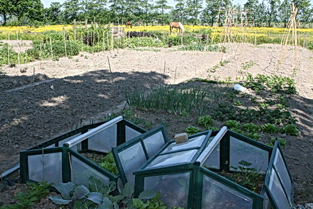 Completer beeld van de situatie ter plekke met op de voorgrond enkele kasjes met bladgroente en aardbeiplanten. Het zou geweldig zijn als er bij het dorp een alternatieve plek voor de volkstuintjes zou kunnen worden gevonden, en een plek voor de paarden…