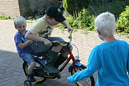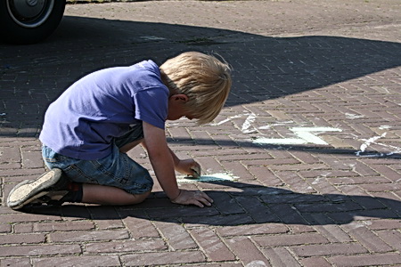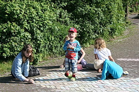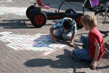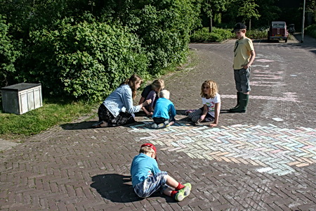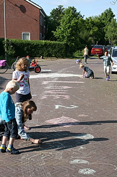 Niet meer zo warm als in de voorbije dagen, maar zonnig nog steeds, deze Pinksterdinsdagmiddag. De korte vakantieperiode afgesloten door een vrije dinsdag met voor veel kinderen activiteiten dichtbij huis. En dan ontstaat er “zo maar” een rustgevende activiteit middenop straat…. Kinderen van verschillende leeftijden, kleurend met bordkrijt en daaraan niet veel woorden vuil makend… Een heerlijke sfeer, soms verbroken door een uitroep: “Pas op, een auto!” Niet vaak op dit tijdstip, doorgaand verkeer mondjesmaat. Even stoppen, daarna weer geconcentreerd verder. Sommige kinderen moeten even wat meer energie kwijt, rénnen…. Of pakken een fiets(je). Een dag later is de gang naar school er weer, de regelmaat van de schooltijden. (Of zijn de vakanties dit jaar anders?) Nu nog even niet…..