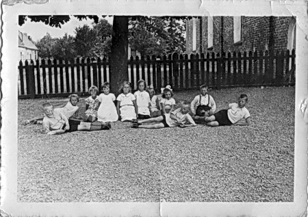 Een groepsfoto met kinderen op het schoolplein van de OLS nabij de toren van de Hervormde kerk. Dit moet dan het zogenaamde jongensplein zijn geweest. Meisje met witte strik: Annie Hiemstra, waarschijnlijk eind jaren dertig. (Annie (1) werd geboren in juni 1929) Wat zou het mooi zijn als er nog namen bekend werden van andere kinderen op deze foto. Wie helpt?????!!