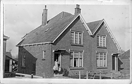 De huurwoning aan de Noorderweg tegenover het kerkhof, jaren dertig. Hier woonde het gezin van Lucas Hiemstra destijds voor het huis aan de Oosterweg werd gebouwd, in de bocht tegenover de achteringang van de Sicke Benninghestede. Op de foto in de voordeur: de kleine Annie en haar moeder, Jo Ottens.