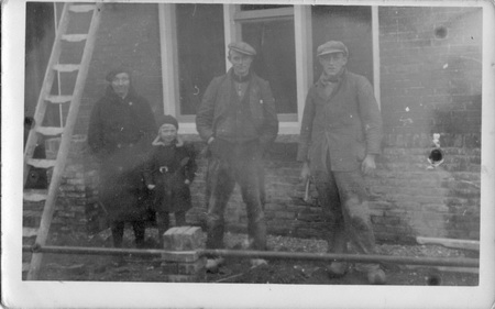 Lucas Hiemstra met een andere bouwvakker bij het nieuwe huis dat hij bouwde aan de Oosterweg (nu nummer 6). Links op de foto Lucas zijn vrouw Jo Ottens en zijn dochtertje, de eerste Annie
