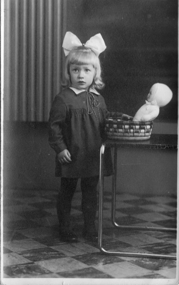 Annie Hiemstra (1) op jonge leeftijd, begin jaren dertig. Een ‘professionele foto’, met rekwisieten…