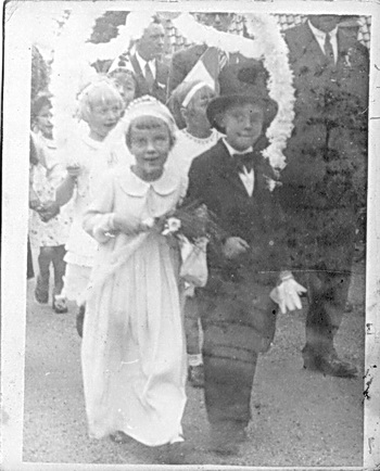 Annie Hiemstra (1) als bruidje in een optocht, waarschijnlijk ter gelegenheid van een schoolfeest, midden jaren dertig. De schoolfeesten waren toen (bijna) echte dorpsfeesten! Wie de anderen zijn???! Wie het weet, mag het zeggen! Graag!