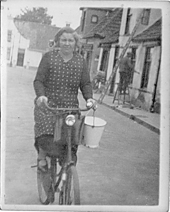 Een foto van Jo Hiemstra-Ottens, de moeder van Annie, op de fiets in de Langestraat, waarschijnlijk ook in de dertiger jaren. Het molenhuis gedeeltelijk op de achtergrond. Let ook op de panden rechts, waaronder het winkelpand van Betje van Dam. “Jeuden Betje” werd later slachtoffer van de jodenvervolging, het pand werd (direct na de bezettingstijd?) gesloopt, het terrein lag enige tijd braak. Pas later werd hier opnieuw gebouwd, een dubbel woonhuis, geen winkel.
