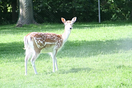 ‘Aagje in mij’ wint…. Toch nog even kijken bij de hertenkamp, een dag na de geboorte van het jonge damhertje. Tegen een uur of vijf slenter ik naar de hertenkamp, waar in een prettige sfeer verschillende kinderen en volwassenen de ruime kraamkamer, op afstand, hebben betreden. De hinde, die gisteren voorspoedig beviel, houdt op afstand van haar jong alles scherp in de gaten. Oppasmoeder Geja vertelt me dat, als er een hond nadert, mama damhert gewoon met de hond meeloopt tot de niet welkome viervoeter verdwijnt…. Overigens lijken ook de twee andere hindes drachtig. De ingehuurde bok heeft zijn taak blijkbaar bijzonder serieus uitgevoerd! De hertenkamp is, zoals het nu gaat, een aantrekkelijke plek voor jong en oud. Respect voor elkaar, en zeker voor dat jonge leven binnen de omheining. ‘Rekening houden met’ tot activiteit verheven! Dit kan een mooie jonge-damherten-zomer worden!