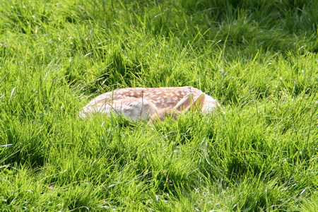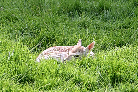 Het was even zoeken in het hogere gras, maar met de hulp van Klaas en Pien is het niet moeilijk het jonge hertje te traceren. Gewenning aan de buitenwereld, al schoongelikt en opgedroogd, helderder van kleur. Rust als opmaat?