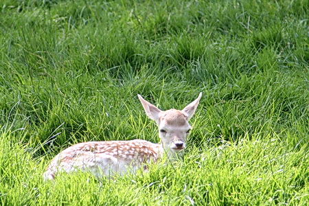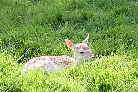 Ja, het hertenjong ontwaakt en steekt heel voorzichtig zijn koppie boven het kampgras. Oren gespitst!