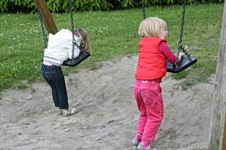 Ook de kleintjes van de kinderopvang waarderen de zonnige hertenkampsituatie, al hebben deze twee een mediterend moment bij de schommels, met de rug naar de dierenweide.