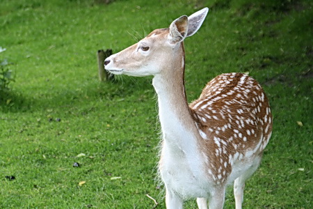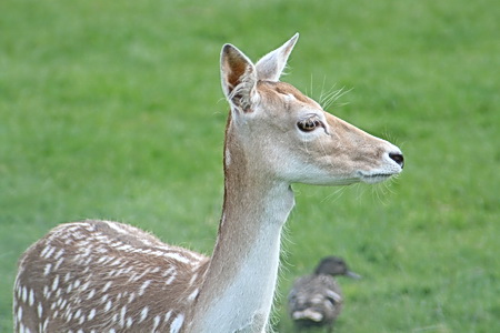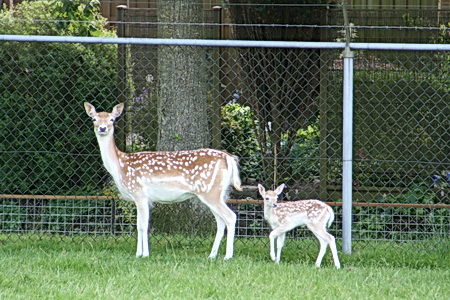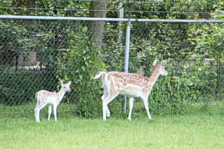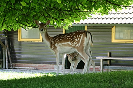 Natuurlijk blijf je benieuwd naar het wel en wee van de dieren in de hertenkamp, met als middelpunt het jonge damhertje. Gisteren al even gekeken, geen hertje te zien. Vanmorgen had ik meer ‘succes’. Al van verre zie ik een trotse hinde (kop op!) met haar jonkie, dat niet van haar zijde wijkt. Waar moe gaat, gaat het kind… Dat zien ook de kinderen van de opvang, al hebben ze minstens zo veel oog voor de eenden en kippen (die kun je brood voeren!) en voor de schommels. Mamma damhert heeft me meteen in de gaten en gaat in sierlijke stijl zo ver mogelijk van me vandaan. Met de telelens is er altijd nog wel een plaatje te schieten. Na een rondgang terug bij bank + afvalbak. De hinde is een beetje zat van mijn gedoe, het hertenjong zoekt de beschutting van de schuur op. De hinde komt naar mij toe met een air van “Als je zonodig foto’s wilt maken, ga je gang, maar laat mijn kleintje met rust!” Ze probeert enkele keren mij weg te lokken. Als dat niet lukt, blijft ze me scherp in het oog houden. Ik gun ze hun rust en trek me terug op de thuisbasis. Nee, de andere hindes hebben nog niet geworpen….