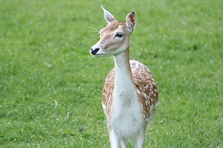 De hinde biedt me werkelijk alle gelegenheid haar van drie kanten te fotograferen. Eén keer laat ze een vervaarlijk geluid horen, verder blijft ze rustig het camerageklik ondergaan. Maar ze houdt me wel scherp in de gaten!
