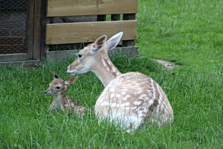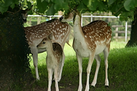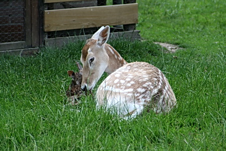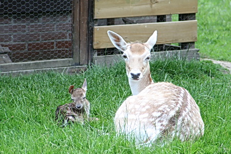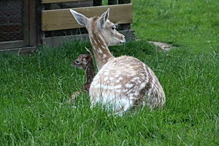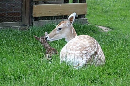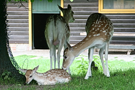 Het eerste damhertenjong is inmiddels ruim twee weken oud en al aardig gegroeid! Hoe kan het ook anders, met twéé moeders…..