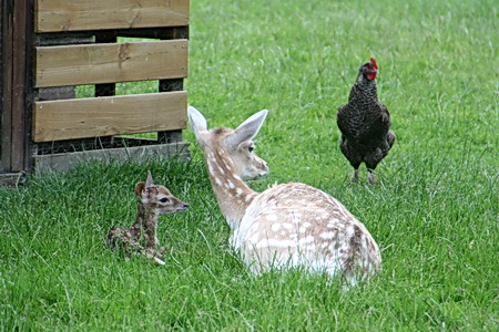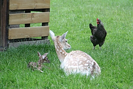 Aan de oostkant van de schuur liggen de hinde en haar jong in het gras, nieuwsgierig gadegeslagen door een van de hennen…