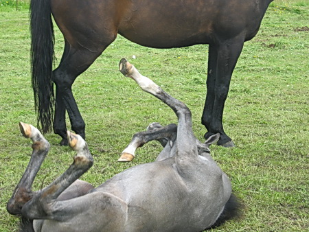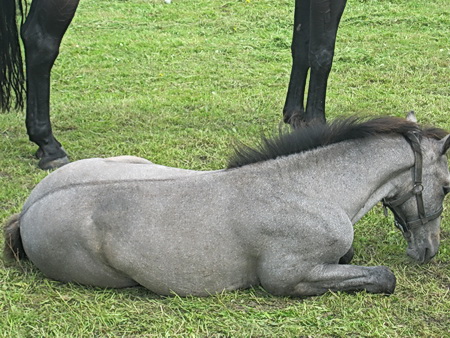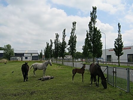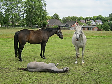 Eerst nog eens langs de paarden van Piet Bos, in het weiland grenzend aan de Industrieweg. Het grijze veulen roerloos op de grond…. Niks aan de hand, toch?