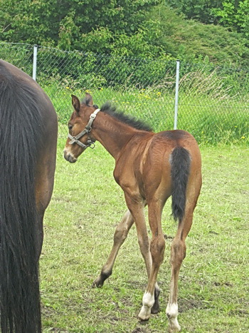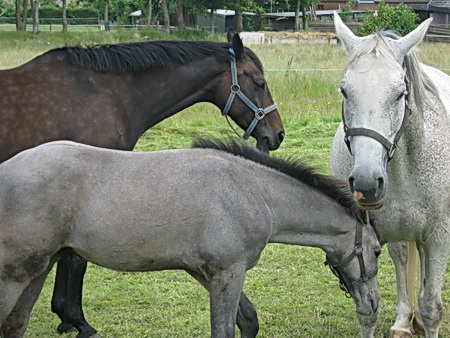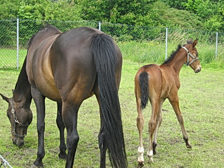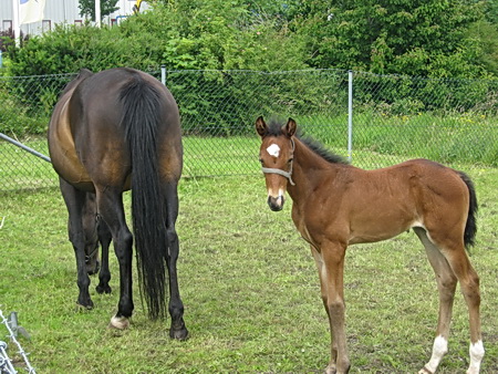 Even afscheid nemen, het bruine veulen keurt me een blik waardig, de moeder laat zich dit gras niet nog eens voor de voeten wegmaaien….