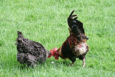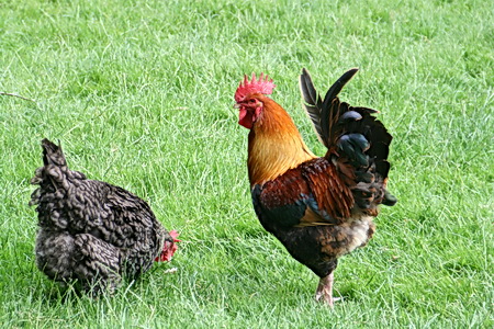 Tweede bestemming deze dinsdag: de hertenkamp! Haan en hen scharrelen, afwisselend de omgeving in de gaten houdend (waar blijven de hapjes????) en iets eetbaars in het gras vindend.
