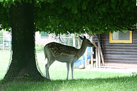 Bewust van de tragedie die zich al heeft afgespeeld, ben ik op dit kiekmoment nog niet. Deze derde hinde moet nog werpen, de twee andere lopen elders zónder de jonkies, die zullen wel in de schuur zijn… (Maar dat het tweede jong dood was, hoorde ik later pas)