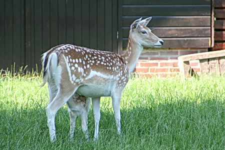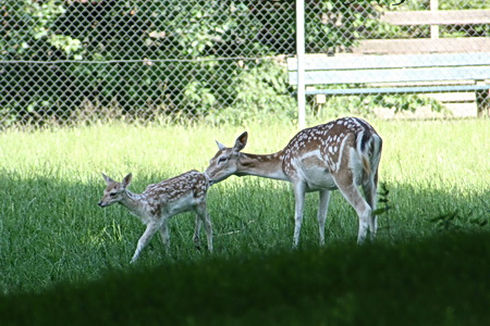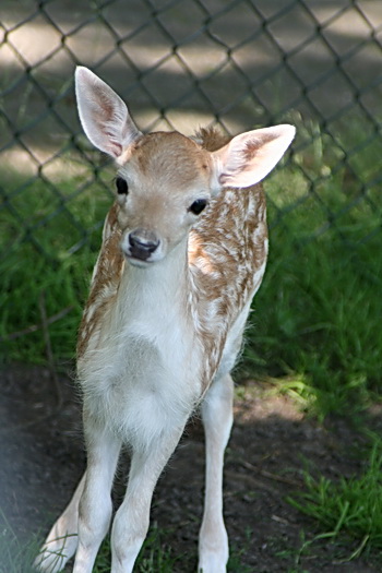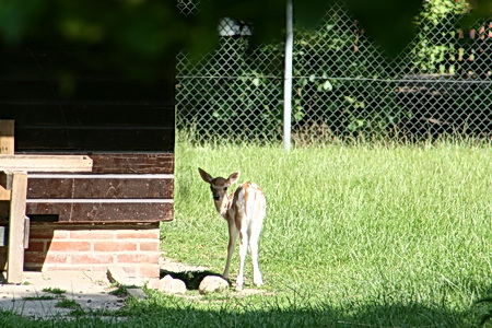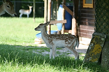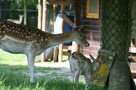 Aan het eind van de middag nog even naar de hertenkamp gewandeld, nieuwsgierig naar het welbevinden van de jonge hertjes! Zonnig weer, half bewolkt, prettige sfeer met enkele ouders en jonge kinderen, én de dieren binnen de omheining…. De prachtige haan vraagt als eerste de aandacht, hij kraait koning, maar of dat een waanbeeld is? Het bijna drie weken oude jonge damhertje dartelt en rent en wordt nauwlettend in het oog gehouden door de moeder. Het pas geboren jonkie ligt in het hoge gras, rustig, oren gespitst… Hier blijft de moeder op afstand. Geen aandacht trekken? Overigens ging het bij de eerstgeborene net zo! De jonge herten geven het dierenverblijf een extra dimensie, vitaliteit, levenskracht, ondanks de tragedie van het tweede jong dat slechts drie dagen werd. Zó lijkt alles goed te gaan en kunnen de kleintjes groter groeien, weerbaar worden. Aanwinsten!