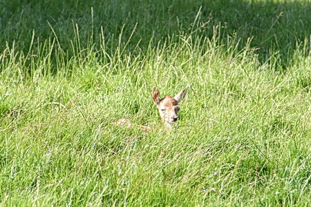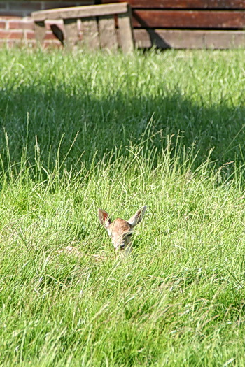Het pasgeboren damhertje, twee dagen oud, ligt in het gedeelte met het wat hogere gras. Oren gespitst, maar rustig…