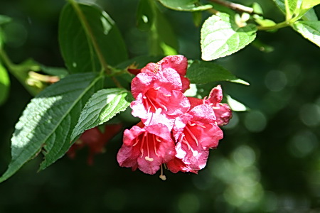 De donkerrode Weigelia als onderbegroeiing in de achtertuin, een trosje bloemen dat zich in de zon koestert…