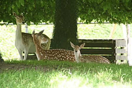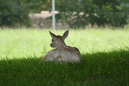 het drie weken oude damhertje voelt zich in de schaduw van de bomen op de bult volkomen veilig, ook voor de lens van de fotograaf….