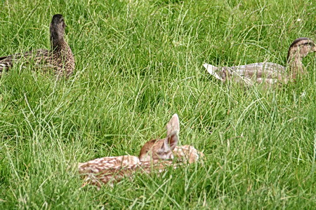 Het jongste damhertje houdt zich van de domme in het hogere gras. Slaapt ze? Volgens mij doet het alsof, de oren zijn gespitst en de ogen af en toe open… Twee eenden komen buurten…