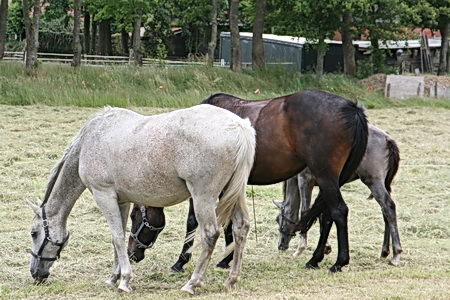 Drie op een rij…. Twee volwassen paarden en een veulen, smullend van het gemaaide gras aan de andere kant van het door Piet Bos gespannen draad op het vroegere zwembadterrein.