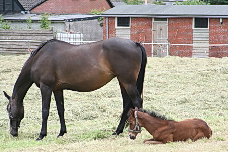 Nog een eter…. Alleen het jongste veulen heeft kennelijk al genoeg gehad. Heerlijk rustend in de nabijheid van de merrie.