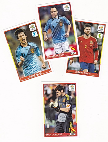 Vier Spaanse geweldenaren die model staan voor een compleet team: De voortreffelijke keeper Casillas, verdediger Piqué (ja, de vriend van…..), middenveldmotor Iniesta en aanvaller Silva. (De keuze is willekeurig, deze plaatjes heb ik dubbel, makkelijker te scannen….)