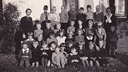 Bij toeval valt er uit het foto-album van Kees de Haan een klein fotootje. “Hé, een foto van de zondagschool!” De foto is gemaakt door mevr.Lofvers, de echtgenote van de toenmalige predikant, plm. 1935.Plaats van handeling: De tuin van de Hervormde Pastorie aan de Oosterweg. De foto (“Noordhorn Nu” mei 2012) levert diverse verrassende reacties op. Henk Geertsema (Noordhorn) meldt dat de leidsters Itje Tempel (links) en Jo van Hoogen (rechts) zijn. (Echter niet Jo, maar Geertje van Hoogen). Een mailtje van Tineke de Boer-Tempel (Burum), dochter van Jan en Ina Tempel uit de Nieuwstraat. Zelf herkent ze Itje Tempel (“zus van Tekke en Fokke en Klaas en Jan…”) en Geertje van Hoogen, en ziet dat haar moeder (Ina Klaver) er ook op staat! “Mijn moeder verblijft momenteel in het Zonnehuis, zij kan u meer vertellen over de personen op de foto!” (Een grotere foto en eentje met nummers afgeleverd in Het Zonnehuis). Drie dagen later: Joop de Haan (Zwolle): “Op deze foto van de zondagschool staan 3 familieleden! Mijn tante Gien Mollema-Bijzitter (Grijpskerk), mijn moeder Iemktje de Haan-Bijzitter (in 2009 overleden) en mijn oom Hielke Bijzitter (overleden in 2011). Joop de Haan denkt dat de foto uit 1935 of 1936 is en dat er ook nog familie van zijn vaders kant op staat. Hij heeft gelijk! Op 18 mei een bericht van Grietje Lenting-Boonstra: “Op de foto staat mijn moeder Sjoertje Boonstra-de Haan (zus van Kees de Haan) en mijn tante Iemktje Bijzitter staat er ook op (de vrouw van Kees de Haan)!”