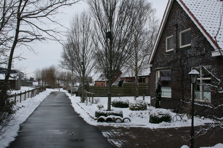 Rechts het huis van Bert en Engly Hummel (in de winter, verkoelend….) Hier hebben zijn ouders ook al gewoond, toen er tegenover dit huis de kassen lagen van de kwekerij (van Groeneveld, Hummels voorganger)