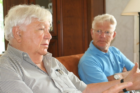 Op de voorgrond Jan Zuijdijk, voormalige evacué; op de achtergrond Sjabbo Datema, ex-veehouder. Samen in de huiskamer van de familie Datema aan het Van Starkenborghkanaal NZ, nummer 35. Beiden waren schoolkinderen in de bezettingstijd.
