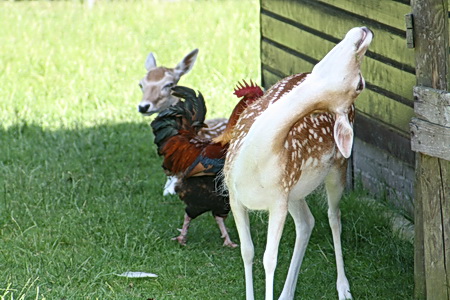 Soms verbazen de herten je met allerlei gymnastische toeren, waarnaar je alleen maar bevreemd en soms afgunstig kunt kijken. Of belemmeren hinde en haan met opzet het zicht op het jongste damhertje?